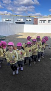 戸外遊びでは、縄跳びをつなげて電車ごっこを楽しんでいます。