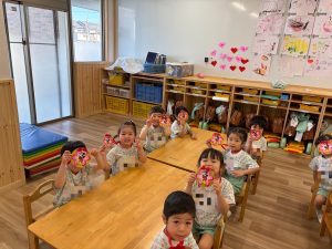 ひな祭りに向けて製作を行いました。はさみの持ち方や紙の押さえ方を確認しながら、慎重にチョキチョキ!