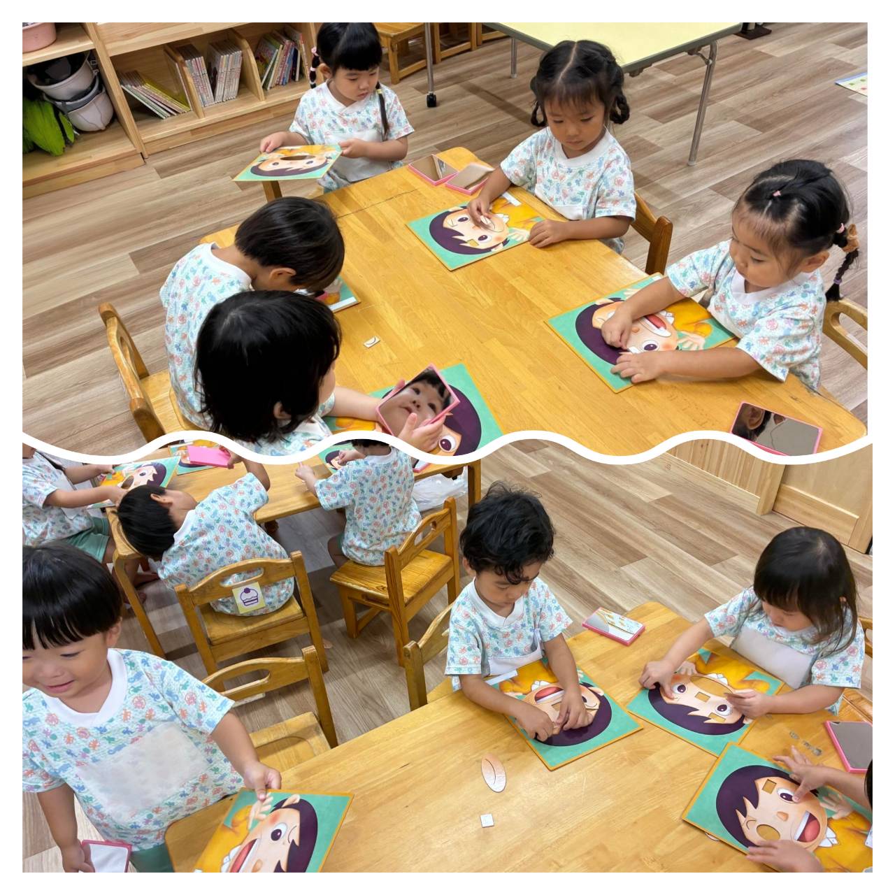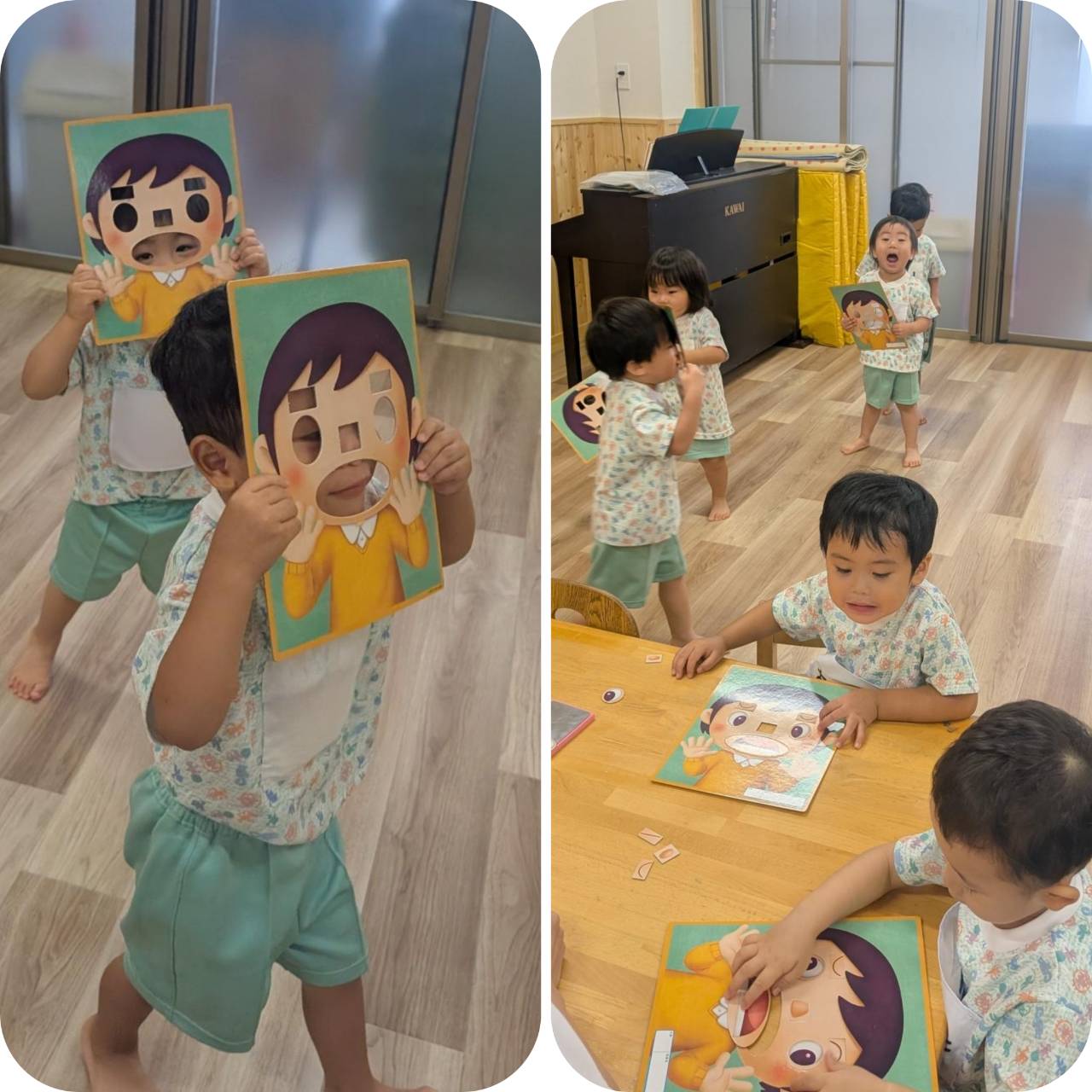 ぽこぽこパズル『いないいないばぁ』では、鏡を使って自分の顔を見ながら目・鼻・口・まゆげの名前や位置を覚えたり、パズルでニコニコな顔、困った顔、ビックリしている顔など、いろんな顔を作って遊びました!