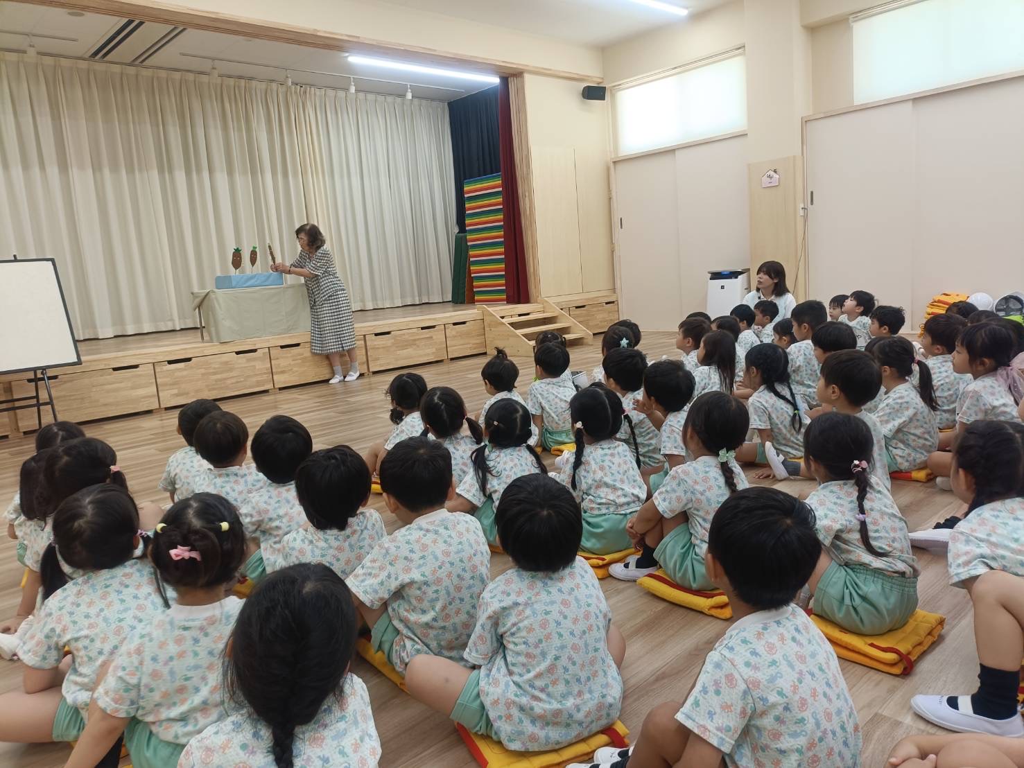 パネルシアターで劇のお話を見て、何の役になろうか楽しみながら考える子どもたち♪