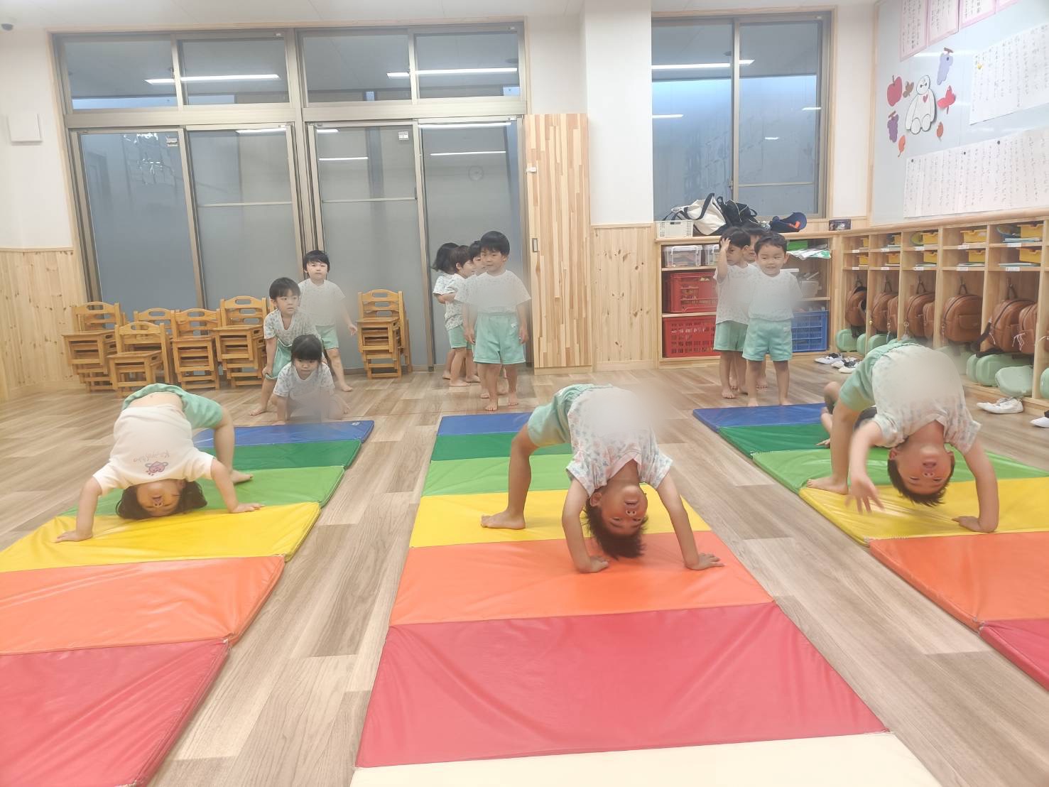 体操ではブリッジ歩きに挑戦中の子どもたち。