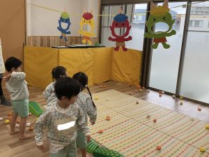 高いところにいる鬼にめがけて豆を投げるゲームもお部屋で楽しみました🎵
