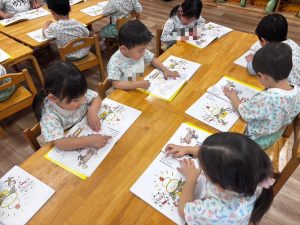 幼稚園ではみんなでコマに色を塗って自分だけのコマを作り上げました。